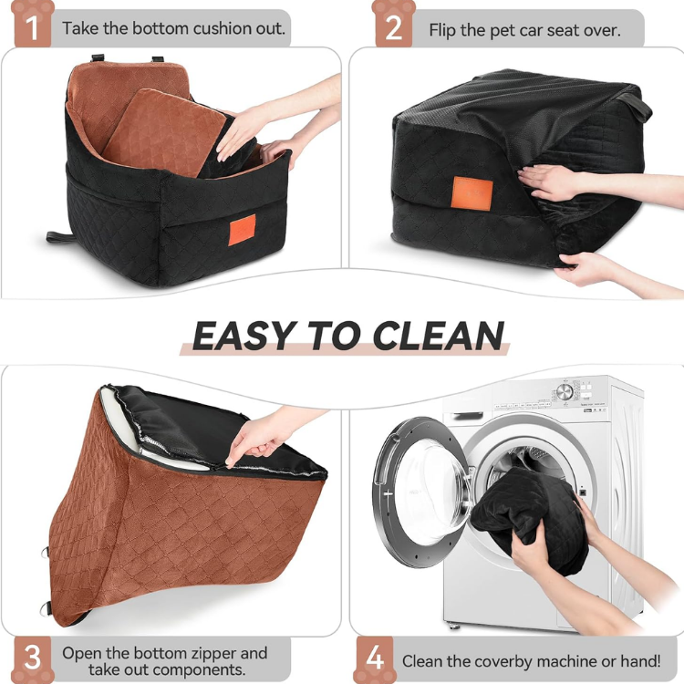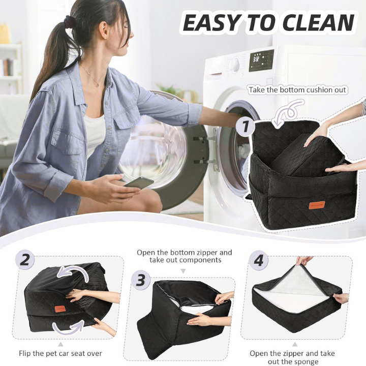 The removable cover is machine washable with pet-safe detergent. Spot clean the seat and straps with a damp cloth for quick touch-ups. Avoid bleach or harsh chemicals and let everything air-dry fully.